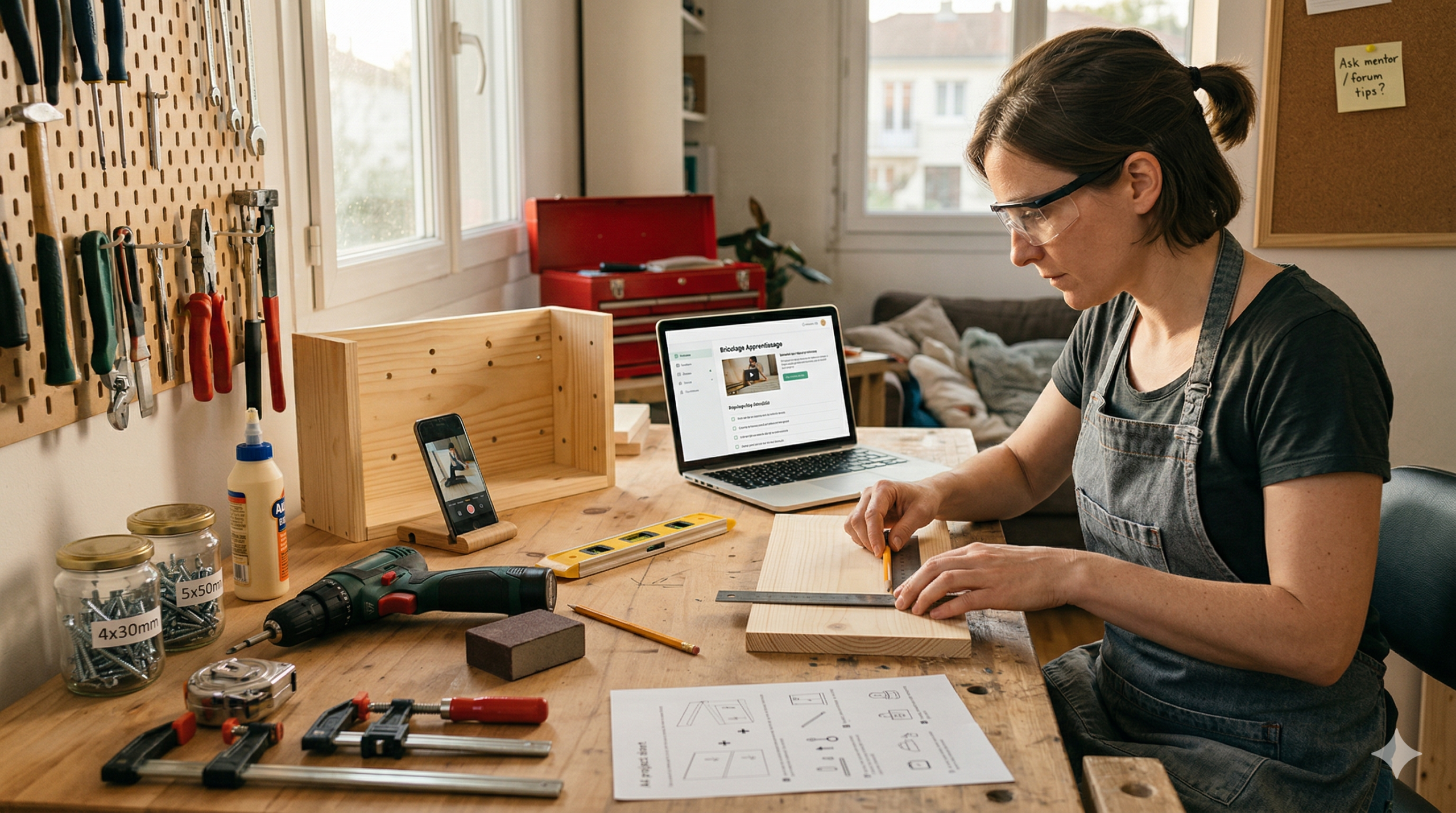 L’idée centrale est simple : vous ne regardez pas des vidéos au hasard. Vous suivez une progression logique, du geste de base jusqu’au projet fini. La plateforme couvre trois grands axes : les fondamentaux (sécurité, mesures, fixations), les projets DIY (meubles, rangements, aménagements) et les finitions (peinture, enduits, joints).